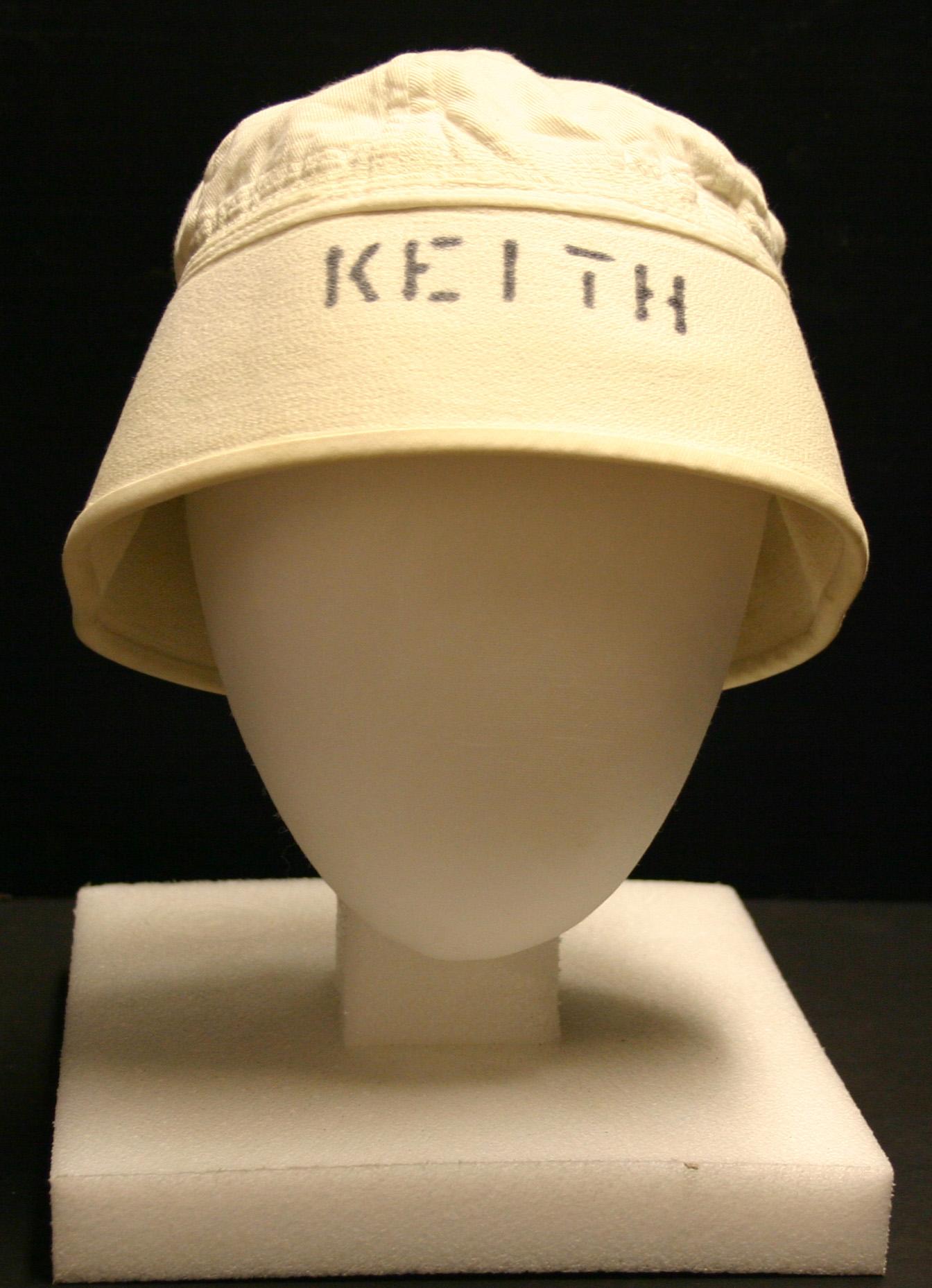 White sailors cap with 'KEITH' applied with a stencil in black on the front.