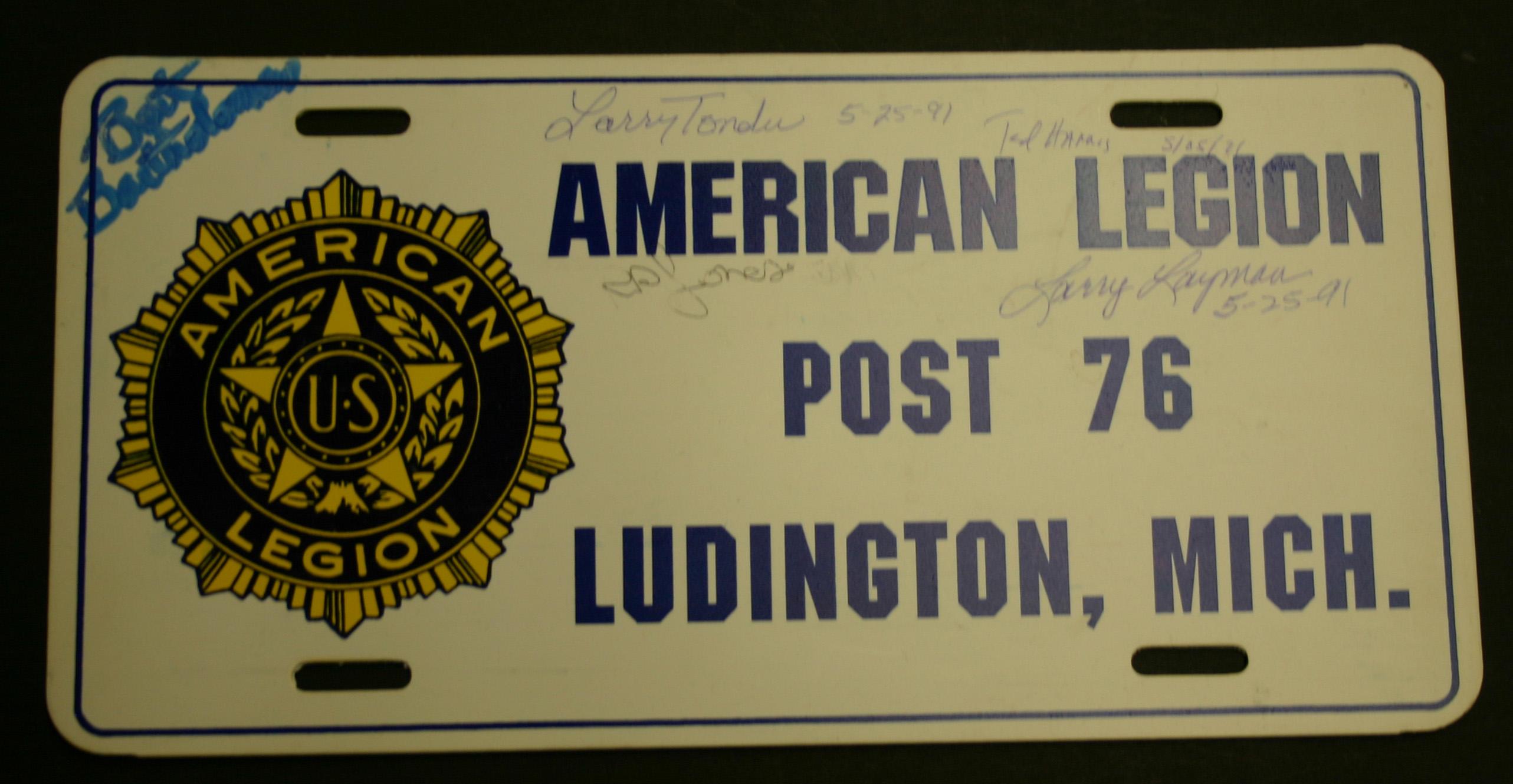 American Legion Post 76, Ludington, Michigan license plate signed by members of Post 76.