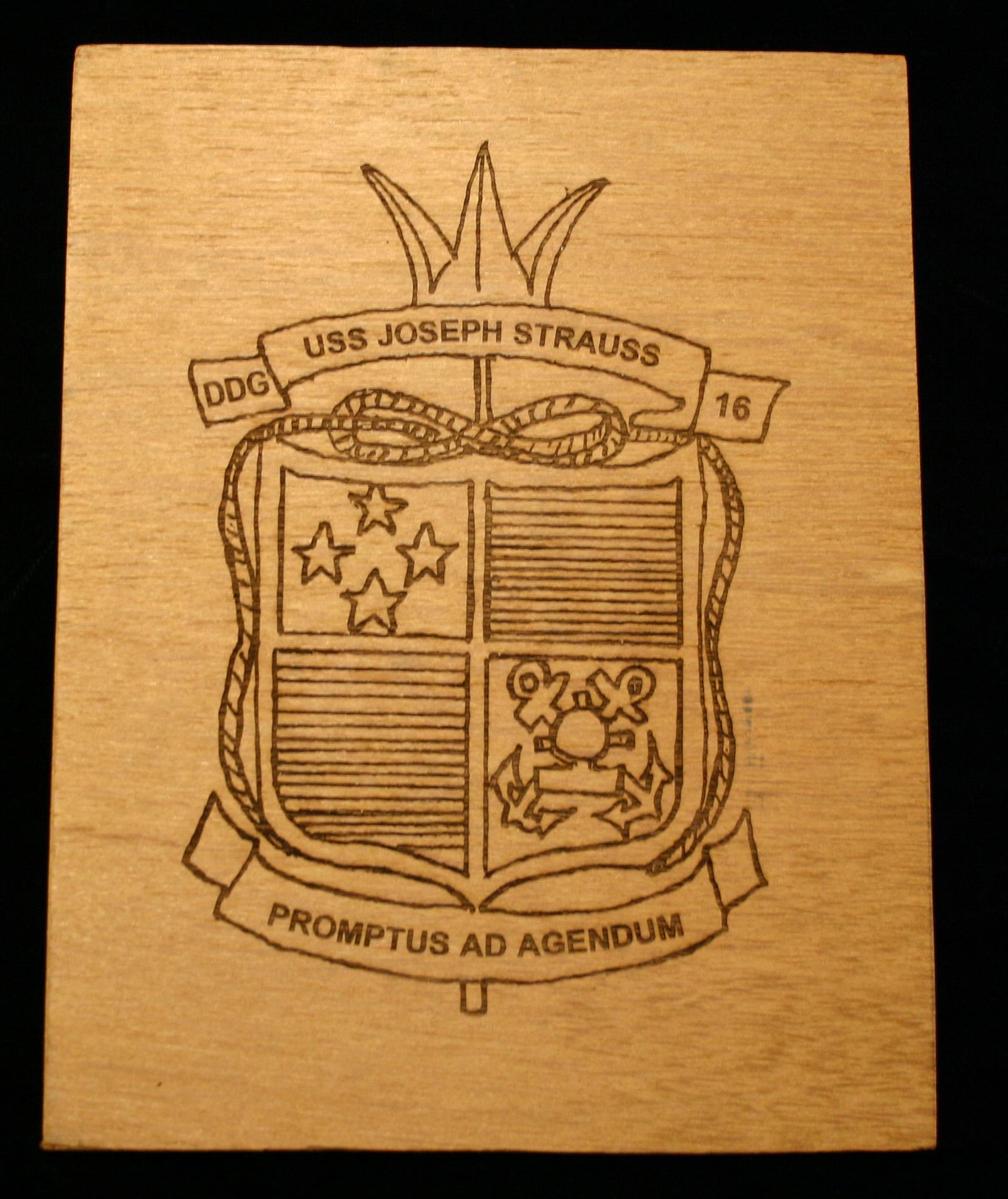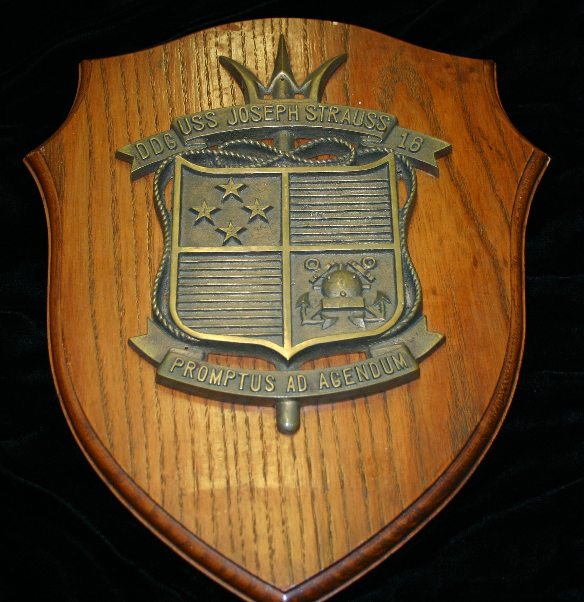 Plaque containing the USS Joseph Strauss (DDG 16) crest in brass.