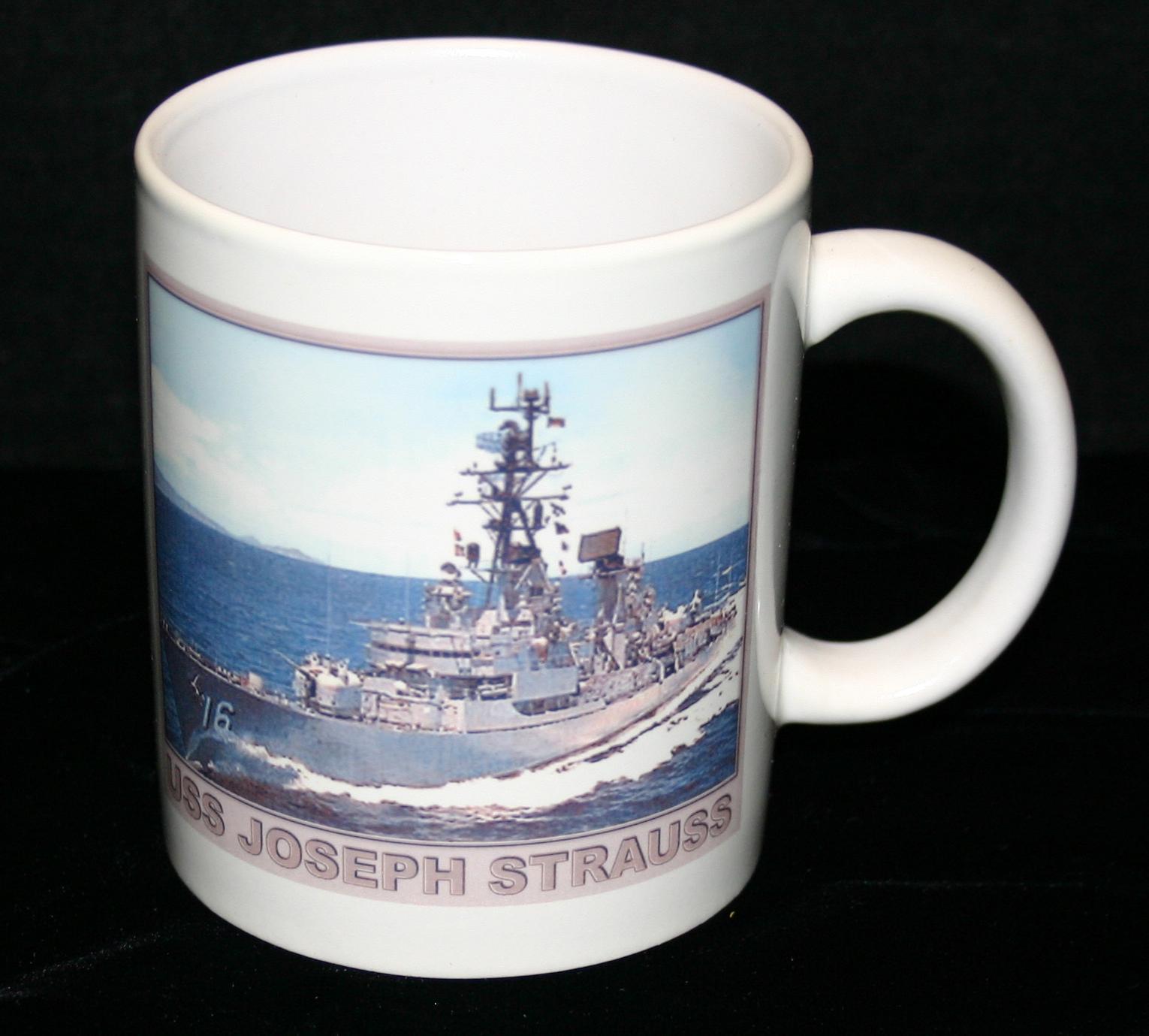 Coffee mug containing an image of the USS Joseph Strauss (DDG 16).