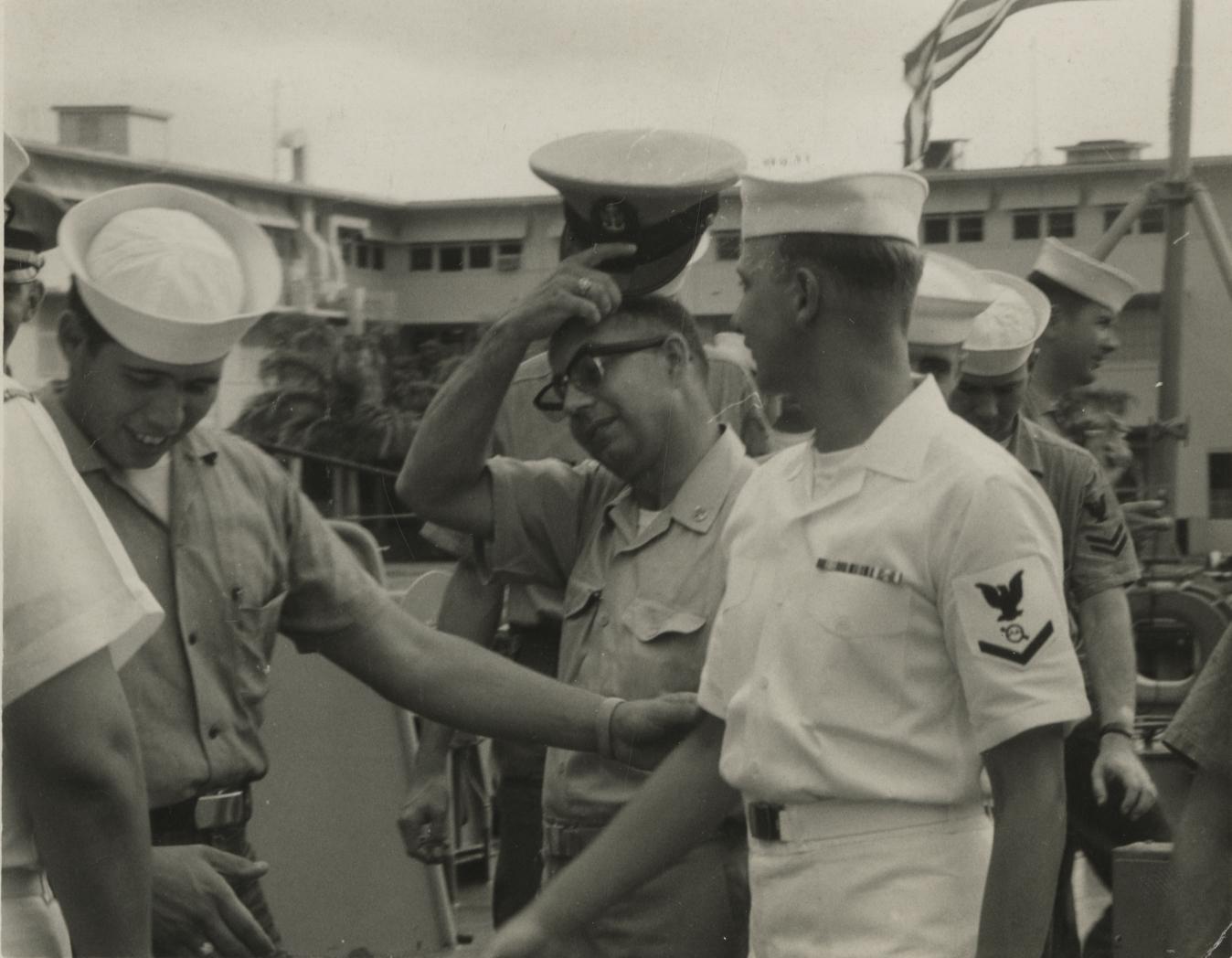 Rod Keith (kneeling far left), unidentified sailors and Naval Officers.