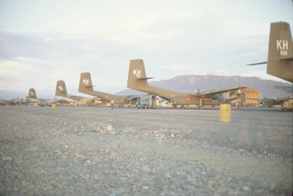 Flight line of C-7As 'Caribous' from 535th Tactical Airlift Squadron.