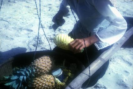 The artistic the way the female vendors peel the pineapples they sell for 35 cents each.