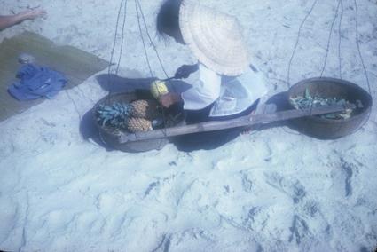 Vendors at Vung Tau beach. Girls are selling pineapples and coconuts.