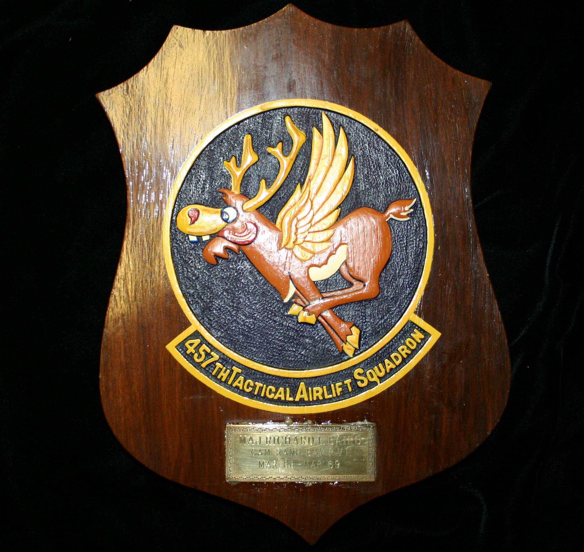 Plaque of the 457th Tactical Airlift Squadron. The 457th was part of the 483rd Tactical Transportation Wing and was located at Cam Ranh Bay, Republic of Vietnam. The plate at the bottom of the plaque reads, 'Major Richard L. Baird, Cam Ranh Bay RVN, Mar 68 - Mar 69.'