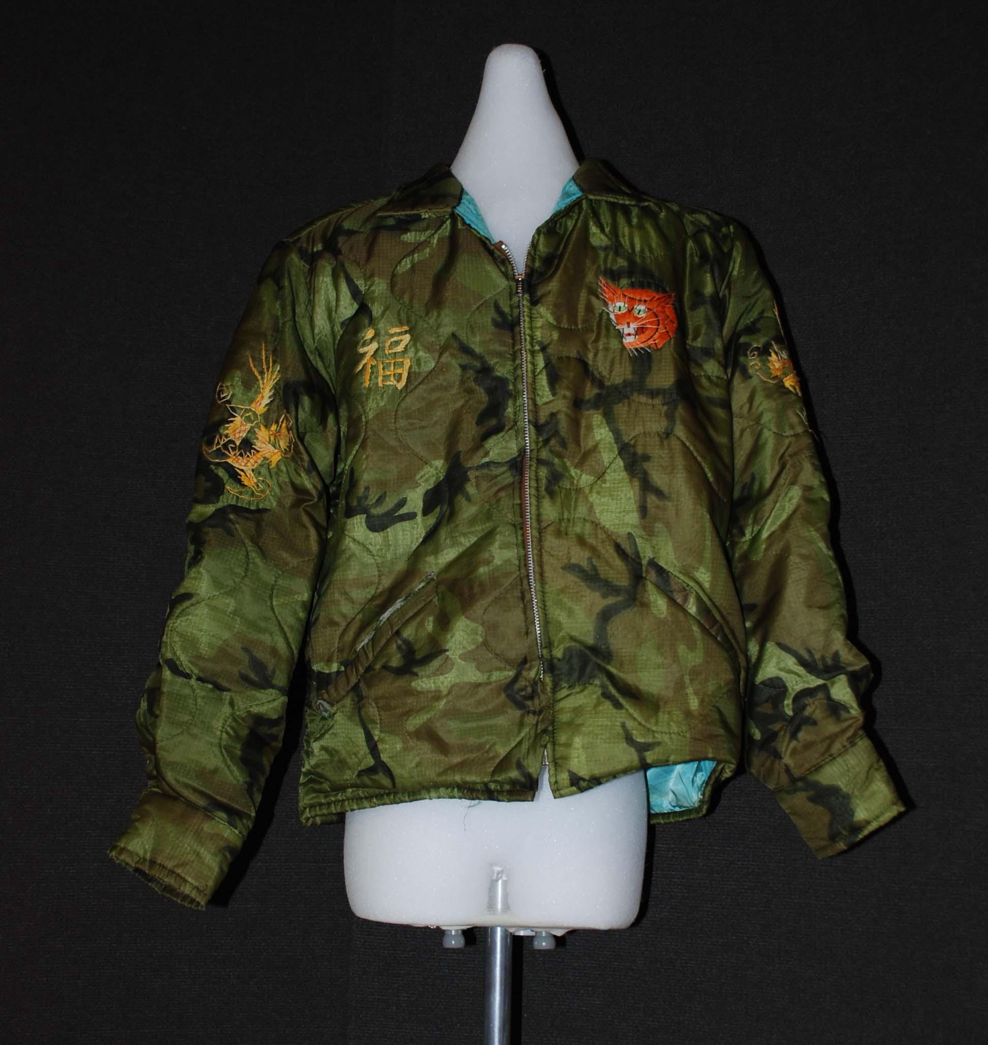 RVN custom 'In Country' embroidered green camouflage satin jacket.
