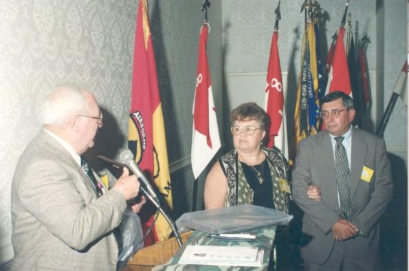 Ray 'Top' Poynter reads the plaque thanking reuion hosts Connie and Bill McCarron, and comending them for a job well done.