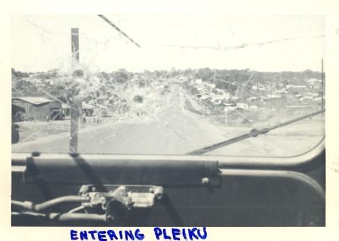 Entering Pleiku. Approaching the town of Pleiku (don't you think it looks a little like going into Souel?) These 2 hole in the windshield were made by Viet-Congs when they fired on jeep last November (nobody got hurt).