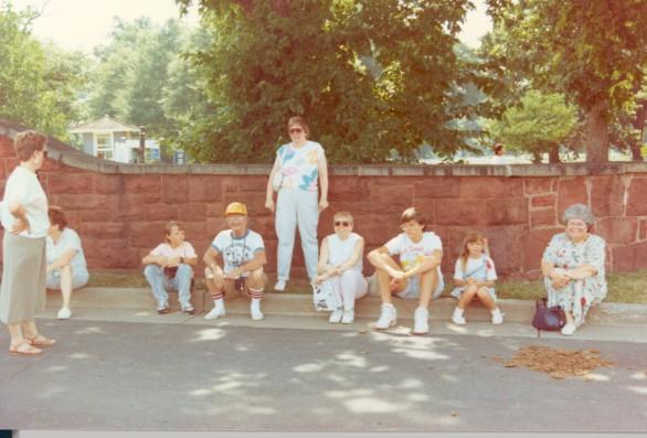 Resting during a tour of an unnamed Historic Fort Jeanne Poynter, Unknown, Harry Heater, Helen Heater, Judy Winandy, unknown, unknown, and Martha Martin