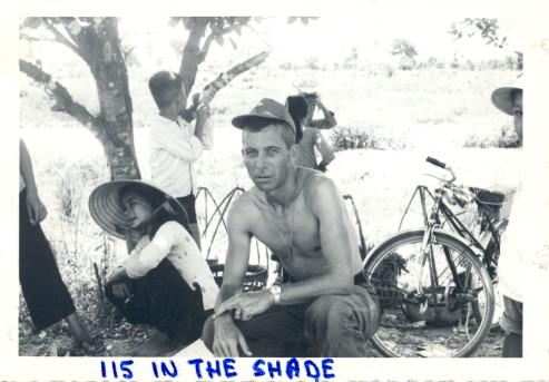 115 in the shade. Your lobo with girls and boys selling fruits and cokes-- it was really hot that day (110) near Ben Cat Oct 65. P.S. You can see the watch I got from you-- real good--and really waterproof because I am taking my baths with the watch on my hand.