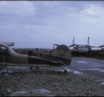The FAC in the photo is Peter Bernstein of Shaker Heights, Ohio, Mike's partner FAC at Tan An. Note the 55-gallon fuel drums. Fuel was brought in by C-7 Caribou, and was hand-pumped through a chamois, into the O-1.