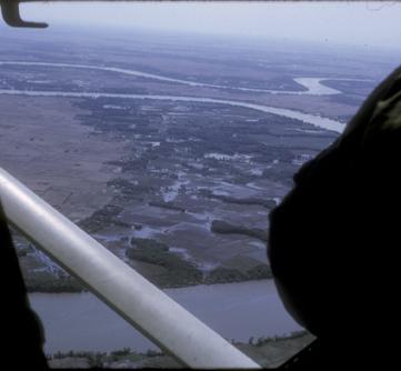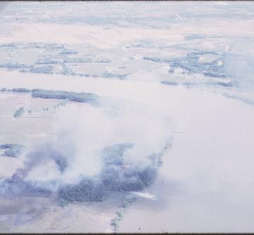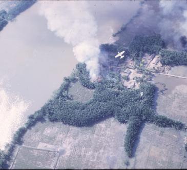 This is a series of photos taken by Mike from the back seat of the O-1. Peter Bernstein is flying and directing the strikes. The fighters are Vietnamese A-1s. The target area is a distinct bend in a river south of Tan An called 'The Testicles.' It was a major rendesvous point for FACs and fighters because it was so easy to find. Any decent map will display it. The target was a series of abandoned villages, and the primary ordnance was napalm. This was most likely Mike's first flight in Long An Privince which was a combination area orientation and strike mission. The poor quality of the photos is largely due to smoke obscuring the target area.