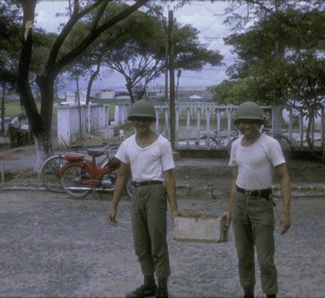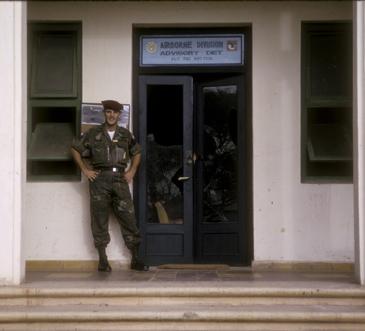 Mike in the ARVNABNDIV uniform which Team 162 wore, in front of the office of the ALO/FAC Section at the ABNDIVHQ at Tan Son Nhut. Note the broken glass and pockmarks from a mortar attack the previous night.