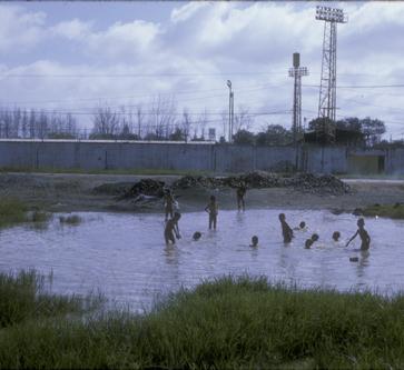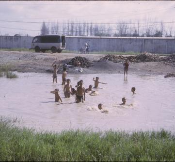Vietnamese kids in a waterhole outside one of the gates at TSN.