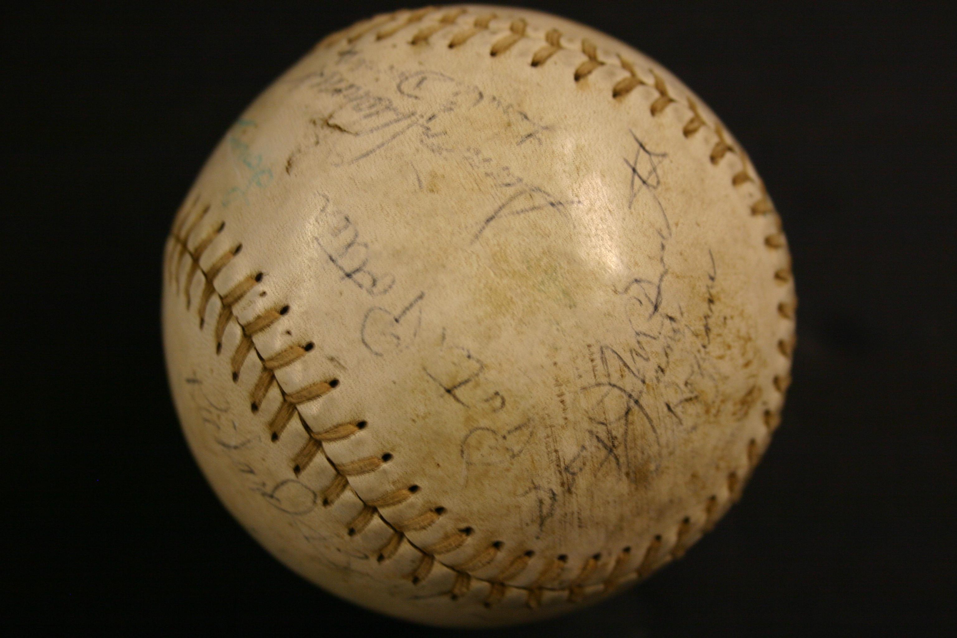 Softball used by the crew of the USS Mahopac during a softball game in Yokosuka, Japan, 3 June 1971. The softball is signed by the following crewman: G. Ruddell, John Decker, Dan Ronan 'Smoke', Jonny, Peter Potter, Stanley (?), Sundance, Richard (?), 'The Hulk', and other illegible names and was presented to Dr. Richard Verrone for inclusion in the Vietnam Archive at the 2006 USS Mahopac reuion in San Diego, CA, 19-23 April 2006.