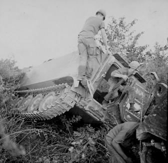 Operation Cedar Falls mission was to clear Viet Cong from the Iron Triangle near Saigon, RVN. The mission of C Company, 1st Battalion, 5th Mechanized Infantry, 2nd Brigade, 25th Infantry Division was to sweep through the Filhol Plantation in search of fleeing Viet Cong units. Members of the company prepare to use one M113 Armored Personnel Carrier to pull another out of a ditch. Photo by Robert C. Lafoon US Army Sp Photo Det, Pacific