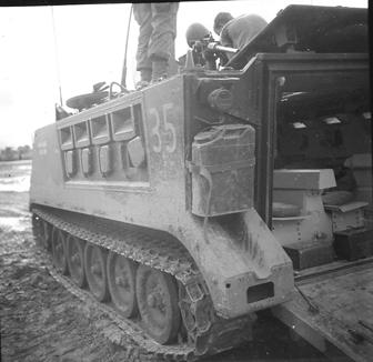 Operation Cedar Falls mission was to clear Viet Cong from the Iron Triangle near Saigon, RVN. The mission of C Company, 1st Battalion, 5th Mechanized Infantry, 2nd Brigade, 25th Infantry Division was to sweep through the Filhol Plantation in search of fleeing Viet Cong units. M113 Armored Personnel Carrier with rifle ports and ramp down is staged and prepared to load troops and supplies. Photo by Robert C. Lafoon US Army Sp Photo Det, Pacific