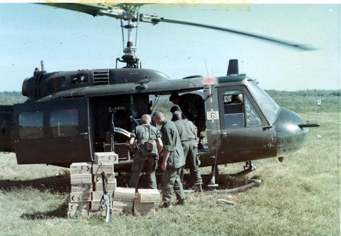 Operation Cedar Falls mission was to clear Viet Cong from the Iron Triangle near Saigon, RVN. The mission of C Company, 1st Battalion, 5th Mechanized Infantry, 2nd Brigade, 25th Infantry Division was to sweep through the Filhol Plantation in search of fleeing Viet Cong units. Cases of C-ratons are off loaded from a UH1D helicopter.. Photo by Robert C. Lafoon US Army Sp Photo Det, Pacific
