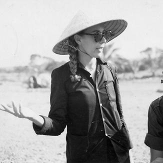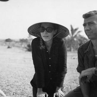 French freelance correspondent, Michelle Ray, was reported missing and possibly captured around 17 January 1967. Ray was captured by the Viet Cong during a long automobile drive. She was released by the Viet Cong and turned up at the 1st Cavalry Division's area of operation February 6, 1967. Michelle Ray dressed in traditional Vietnamese clothing and hat conversing with an officer from the 1st Cav. Photo by Robert C. Lafoon