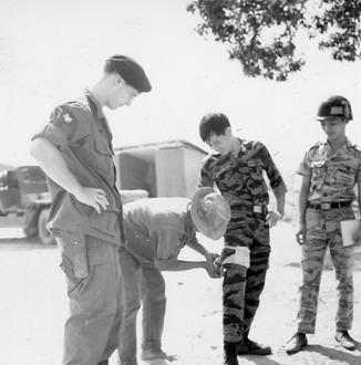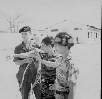 Republic of Vietnam, Camp Trai Trung Sup, the 3rd Corps Basic Training Center of the Civilian Irregular Defense Group (CIDG) is commanded by the Vietnamese Special Forces (LLDB) and advised by Detachment A, 5th US Special Forces. Using a volunteer trainee, an instructor from 5th Special Forces and LLDB teach CIDG trainees how to apply a tourniquet. Photo by Robert C. Lafoon US Army Sp Photo Det, Pacific