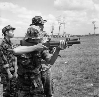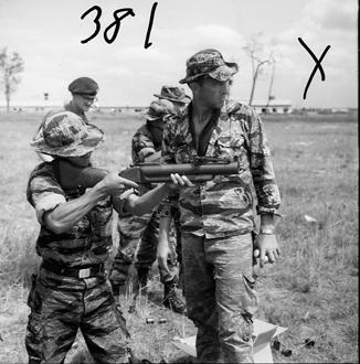 Republic of Vietnam, Camp Trai Trung Sup, the 3rd Corps Basic Training Center of the Civilian Irregular Defense Group (CIDG) is commanded by the Vietnamese Special Forces (LLDB) and advised by Detachment A, 5th US Special Forces. Staff Sgt. Alvin J. Rouly supervises CIDG trainees firing M-79 grenade launchers for familiarization.