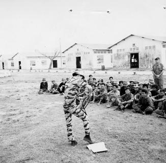 Republic of Vietnam, Camp Trai Trung Sup, the 3rd Corps Basic Training Center of the Civilian Irregular Defense Group (CIDG) is commanded by the Vietnamese Special Forces (LLDB) and advised by Detachment A, 5th US Special Forces. An LLDB instructor teaches CIDG trainees while a 5th Special Forces adviser observes from behind the seated students. Photo by Robert C. Lafoon US Army Sp Photo Det, Pacific