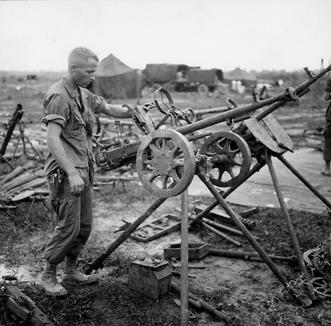Viet Cong captured individual and crew served weapons were on display at the Fire Support Base of the 3rd Battalion, 5th Cavalry, 1st Cavalry Division. These weapons were found in an abandon Viet Cong tunnels. A soldier examines captured anti aircraft machine guns. Photo by Robert C. Lafoon US Army Sp Photo Det, Pacific