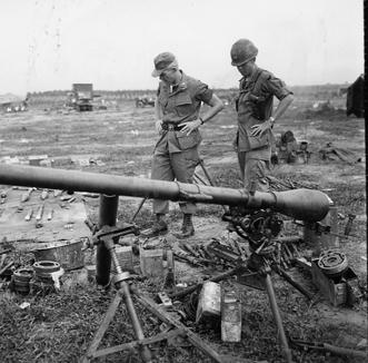 Viet Cong captured individual and crew served weapons were on display at the Fire Support Base of the 3rd Battalion, 5th Cavalry, 1st Cavalry Division. These weapons were found in an abandon Viet Cong tunnels. BG George H. Young, Deputy Chief of Staff for Operations and Plans, USARV (wearing soft cap) and his aide examine the captured weapons. Photo by Robert C. Lafoon US Army Sp Photo Det, Pacific