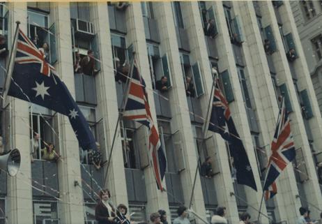 Australians fill the streets and look out windows to see President Lyndon Johnson traveling in a motorcade. President Johnson visited several Australian cities to try and drum up Aussie support for the Vietnam War. Photo by Robert C. Lafoon. US Army Sp Photo Det, Pacific