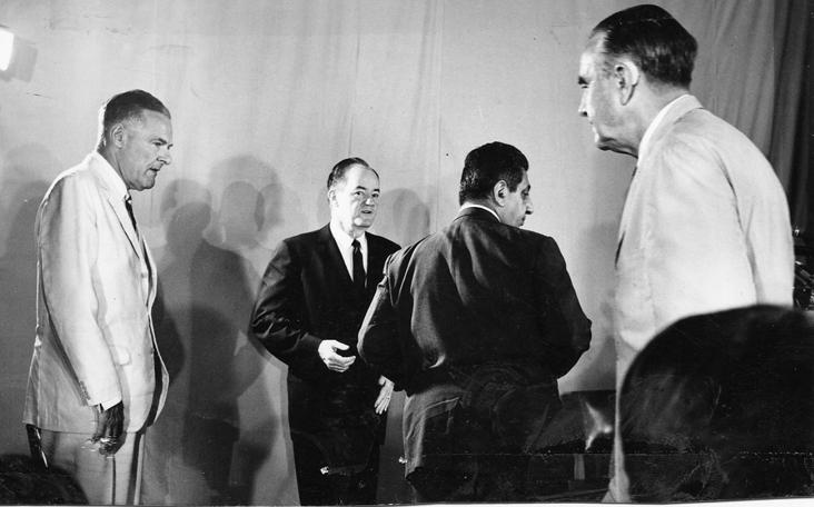 In Saigon, Vice President Hubert Humphrey visited with Ambassador Lodge and other American dignitaries as a part of a Vietnam War fact-finding tour. All photographed were conducting a pre-press conference side bar.Photo by Robert C. Lafoon US Army Sp Photo Det, Pacific