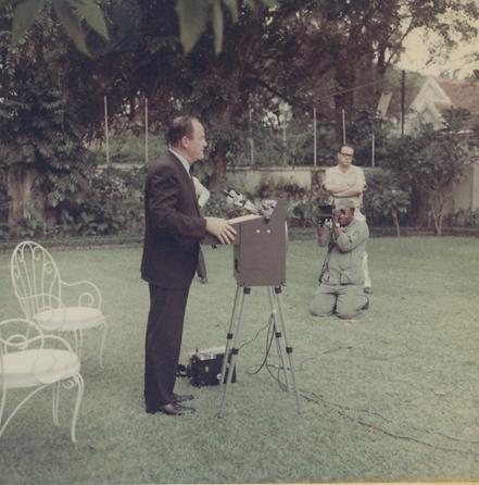 In late 1967, Vice President Humphrey made a second trip to Vietnam for the inaugurations of Vietnam President Thieu and Vice President Ky. In this photograph DASPO photographer Robert Lafoon is photographing VP Humphrey during a press conference. Photo by Robert C. Lafoon US Army Sp Photo Det, Pacific