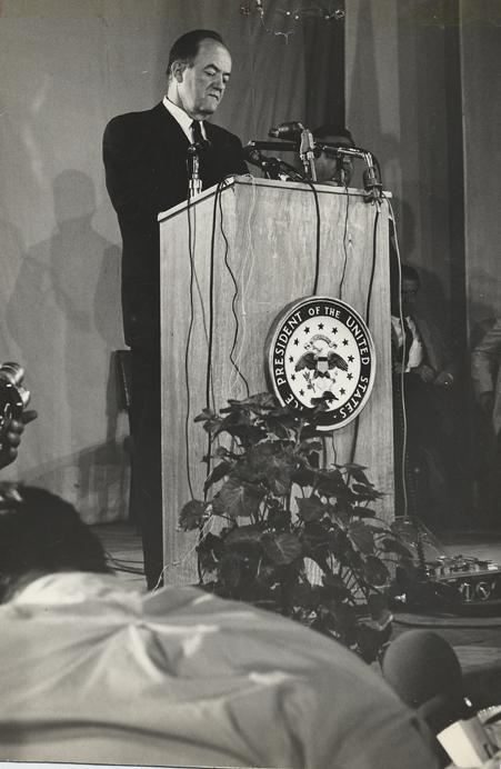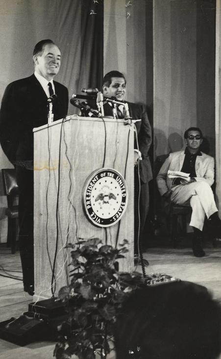 In Saigon during February 1966, Vice President Humphrey visited with Ambassador Lodge and other American diginitaries as a part of a Vietnam War fact-finding tour. These photographs were taken during a press conference given by the VP. Photo by Robert C. Lafoon US Army Sp Photo Det, Pacific