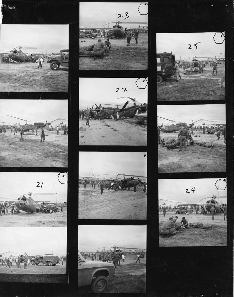 Two helicopters collided at a helicopter landing pad near Tan Shan Nhut Airport, Saigon in 1967. One helicopter flew over another helicopter as it was taking off. They collided a few feet in mid air with one crashing on the top of the other. The dead and injured were evacuated to a near by hospital. Photo by Robert C. Lafoon US Army Sp Photo Det, Pacific