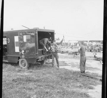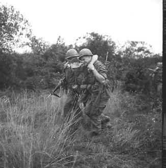 In a secured area on the outskirts of Saigon, medics and members of an Aviation Medical Evacuation Unit practice airlifting a soldier from the ground, up into a Huey using a cable hoist, and then fly to a local medical facility. Speed and technique were graded and all concerned received a thumbs-up. Mock wounded soldier is assisted to the airlift pick up area. Photo by Robert C. Lafoon US Army Sp Photo Det, Pacific