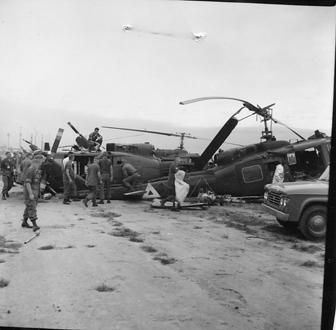 Two helicopters collided at a helicopter landing pad near Tan Shan Nhut Airport, Saigon in 1967. One helicopter flew over another helicopter as it was taking off. They collided a few feet in mid air with one crashing on the top of the other. The dead and injured were evacuated to a near by hospital.Photo by Robert C. Lafoon US Army Sp Photo Det, Pacific