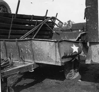 The 1st Logistical Command's motor pool located by Tan San Nhut was attacked by Viet Cong using heavy weapons. The Military Assistance Command later reported the following casualties: 3 US and friendly wounded, 3 Army of Vietnam killed and 9 wounded. Damaged trailer bed.. Photo by Robert C. Lafoon US Army Sp Photo Det, Pacific