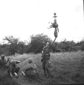 In a secured area on the outskirts of Saigon, medics and members of an Aviation Medical Evacuation Unit practice airlifting a soldier from the ground, up into a Huey using a cable hoist, and then fly to a local medical facility. Speed and technique were graded and all concerned received a thumbs-up. Mock wounded soldier receives medical attention for a pretend head wound while another soldier radios for a MEDEVAC helicopter. Photo by Robert C. Lafoon US Army Sp Photo Det, Pacific