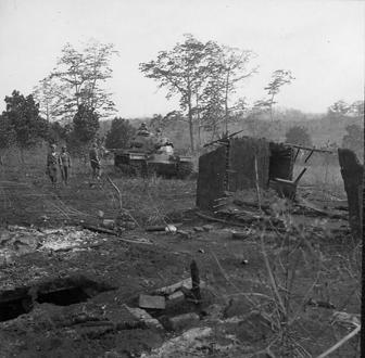 The 1st Infantry Division participates in Operation Crimp. The objective is to seek and destroy a Viet Cong headquarters believed to be in a tunnel complex in or around the Ho Bo woods and close to Saigon. Personnel of the 1st Battalion, 28th Infantry, 1st Infantry Division move through open clearing while conducting their search and destroy mission. An M48A3 accompanies the soldiers on their sweep. Photo by Robert C. Lafoon US Army Sp Photo Det, Pacific