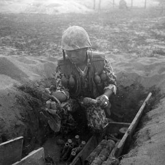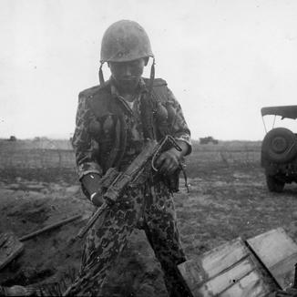 During Operation Van Buren The Republic of Korea's Marines of the 6th Company, 2nd Battalion, 3rd Brigade, working with the 101st Airborne, were charged with protecting the rice harvests in and around Tuy Hoa, RVN. The unit was a part of the Blue Dragoon Brigade. PFC Chen Young Bo examines a weapon the unit captured earlier during Operation Jefferson. Photo by Robert C. Lafoon US Army Sp Photo Det, Pacific
