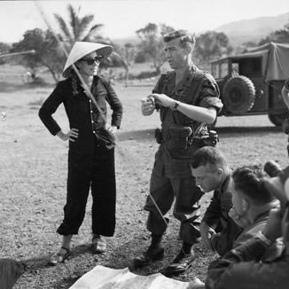 French freelance correspondent, Michelle Ray, was reported missing and possibly captured around 17 January 1967. Ray was captured by the Viet Cong during a long automobile drive. She was released by the Viet Cong and turned up at the 1st Cavalry Division's area of operation February 6, 1967. Michelle Ray dressed in traditional Vietnamese clothing and hat conversing with an officer from the 1st Cav. Photo by Robert C. Lafoon US Army Sp Photo Det, Pacific