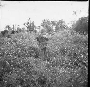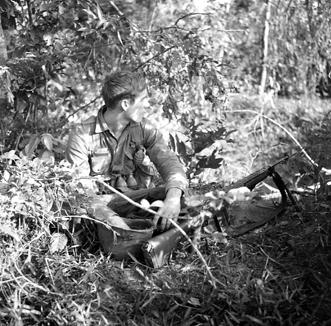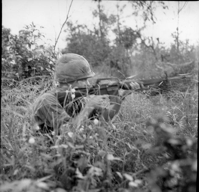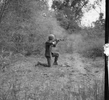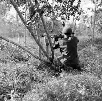 Operation Cedar Falls mission was to clear Viet Cong from the Iron Triangle near Saigon, RVN. The mission of C Company, 1st Battalion, 5th Mechanized Infantry, 2nd Brigade, 25th Infantry Division was to sweep through the Filhol Plantation in search of fleeing Viet Cong units. From a kneeling position, soldier returns rifle fire into a suspected Viet Cong position. Photo by Robert C. Lafoon US Army Sp Photo Det, Pacific