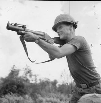 Operation Cedar Falls mission was to clear Viet Cong from the Iron Triangle near Saigon, RVN. The mission of C Company, 1st Battalion, 5th Mechanized Infantry, 2nd Brigade, 25th Infantry Division was to sweep through the Filhol Plantation in search of fleeing Viet Cong units. Soldier fires his M79 grenade launcher into a Viet Cong position. Photo by Robert C. Lafoon US Army Sp Photo Det, Pacific