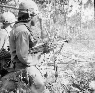 Operation Cedar Falls mission was to clear Viet Cong from the Iron Triangle near Saigon, RVN. The mission of C Company, 1st Battalion, 5th Mechanized Infantry, 2nd Brigade, 25th Infantry Division was to sweep through the Filhol Plantation in search of fleeing Viet Cong units. PFC Milton L. Cook (Baltimore, MD) a machine gunner, fires his M60 Machine Gun into an area where a Viet Cong sniper was spotted. Photo by Robert C. Lafoon US Army Sp Photo Det, Pacific