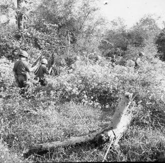 Operation Cedar Falls mission was to clear Viet Cong from the Iron Triangle near Saigon, RVN. The mission of C Company, 1st Battalion, 5th Mechanized Infantry, 2nd Brigade, 25th Infantry Division was to sweep through the Filhol Plantation in search of fleeing Viet Cong units. Soldiers sweep through dense brush in search of fleeing Viet Cong units. Photo by Robert C. Lafoon US Army Sp Photo Det, Pacific
