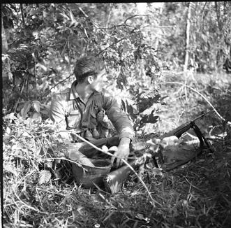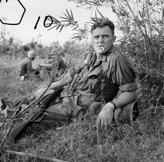 Operation Cedar Falls mission was to clear Viet Cong from the Iron Triangle near Saigon, RVN. The mission of C Company, 1st Battalion, 5th Mechanized Infantry, 2nd Brigade, 25th Infantry Division was to sweep through the Filhol Plantation in search of fleeing Viet Cong units. Soldier relaxes and has a smoke during a break in the sweep. Photo by Robert C. Lafoon