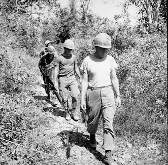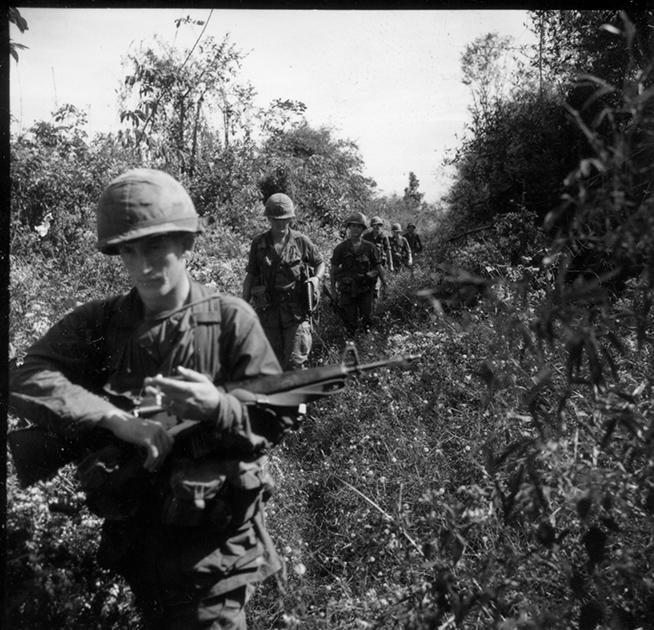 Operation Cedar Falls mission was to clear Viet Cong from the Iron Triangle near Saigon, RVN. The mission of C Company, 1st Battalion, 5th Mechanized Infantry, 2nd Brigade, 25th Infantry Division was to sweep through the Filhol Plantation in search of fleeing Viet Cong units. Squad of 5th Mechanized soldiers search along a trail. Photo by Robert C. Lafoon US Army Sp Photo Det, Pacific