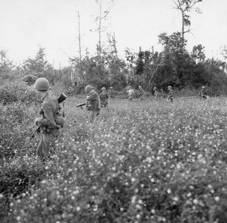 During Operation Cedar Falls, the 25th Infantry Division's objective was to help clear the Iron Triangle and seal off the Saigon River. Members of the 5th Mechanized Infantry Regiment move through chest-high brush in search of Viet Cong. Dick Welsh, DASPO cameraman, can be seen reloading his camera in the foreground. Dick is the only soldier with baseball a cap on instead of a helmet. Photo by Robert C. Lafoon US Army Sp Photo Det, Pacific