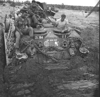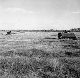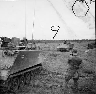 Operation Cedar Falls mission was to clear Viet Cong from the Iron Triangle near Saigon, RVN. The mission of C Company, 1st Battalion, 5th Mechanized Infantry, 2nd Brigade, 25th Infantry Division was to sweep through the Filhol Plantation in search of fleeing Viet Cong units. After dismounting from their M113 Armored Personnel Carriers, members of the 5th Mechanized move by foot across an open area. The M113s move with soldiers and bring up the rear. Photo by Robert C. Lafoon US Army Sp Photo Det, Pacific