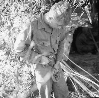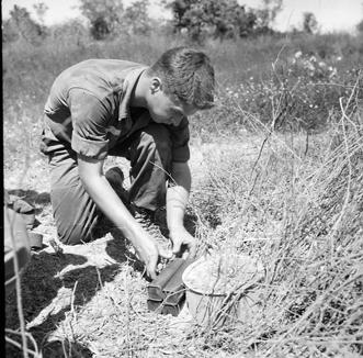 Operation Cedar Falls mission was to clear Viet Cong from the Iron Triangle near Saigon, RVN. The mission of C Company, 1st Battalion, 5th Mechanized Infantry, 2nd Brigade, 25th Infantry Division was to sweep through the Filhol Plantation in search of fleeing Viet Cong units. During the sweep an anti-tank mine was found and destroyed. Demolition expert, SP4 Randy R. Farmer prepares TNT and a fuse which will be used to destroy the mine. Photo by Robert C. Lafoon US Army Sp Photo Det, Pacific