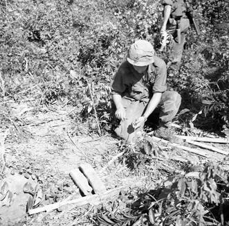 Operation Cedar Falls mission was to clear Viet Cong from the Iron Triangle near Saigon, RVN. The mission of C Company, 1st Battalion, 5th Mechanized Infantry, 2nd Brigade, 25th Infantry Division was to sweep through the Filhol Plantation in search of fleeing Viet Cong units. During the sweep an anti-tank mine was found and destroyed. Demolition expert prepares TNT and a fuse which will be used to destroy the mine. Photo by Robert C. Lafoon US Army Sp Photo Det, Pacific
